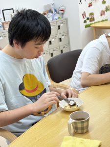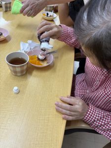 本日は手作りおやつ日のため利用者様、皆様でプリンアラモードを作りました。✨