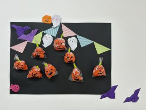 折り紙でコウモリ🦇やオバケ👻を利用者様に折っていただきさらに素敵なハロウィン装飾ができました。