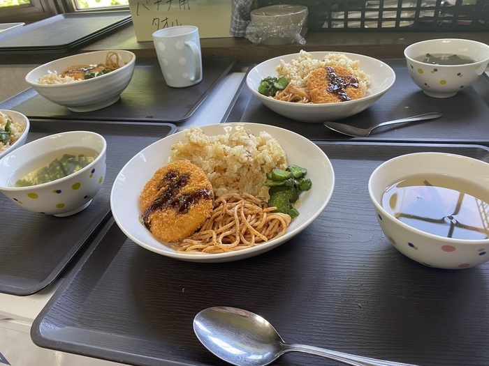 付け合わせはコロッケ、ナポリタン、漬物…。